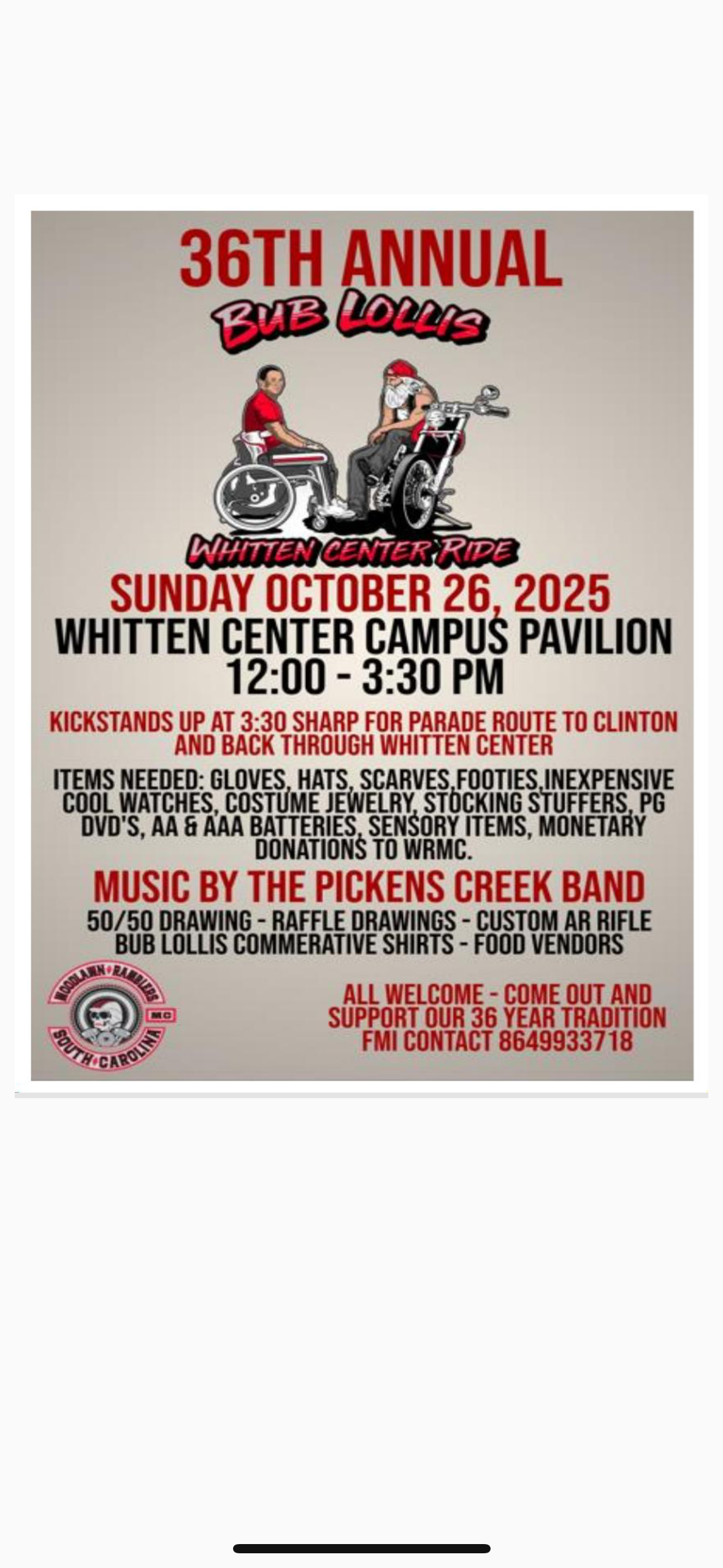 The Woodlawn Ramblers Riding Club has had a long-standing relationship with Whitten Center. We are deeply grateful for their kindness toward us, shown through their generous financial donations and collection of needed items for our residents. The highlight of the year for our residents, their families, and our staff is the semi-annual Bub Lollis Ride every spring and fall! Please bring your family and join us in the spring for this event with big-hearted friends who love our special folks…a high energy afternoon with live music, food trucks, etc. begins at noon. And an unforgettable motorcycle “parade” at 3:30!